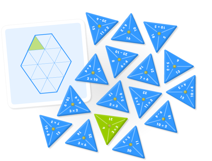 Associez les triminos de manière à reconstituer la figure dessinée sur la carte modèle. Une petite aide : une opération se trouve toujours associée à un résultat. ![]()
