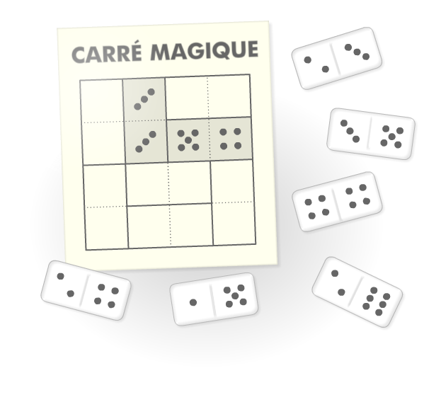 Complétez le carré magique avec les 6 dominos de façon à ce que chaque ligne, chaque colonne et chaque diagonale totalise 14 points.